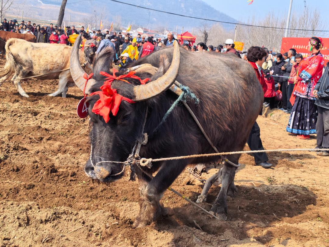参加这场闹春牛展演的,都是上双疃村及周边村经验丰富的使牛老把式,6头登场的水牛、黄牛也基本是多次亮相的“老演员”。“不能全是黄牛,也不能都是水牛。混着来不顶架。”老把式们守着多年的经验,而这些常年与红绸大红花相伴的耕牛,也早已克服了对红色的本能畏惧,成了懂规矩的“民俗明星”。