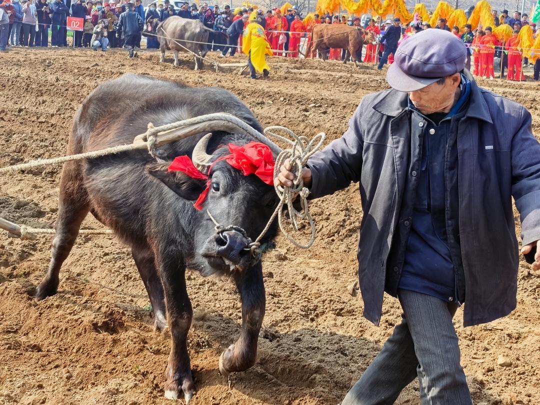 在黄墩镇,耕牛并未完全退出农耕舞台。山岭薄地的现实地貌,让牛耕成为机械化耕作的重要补充。葛疃村74岁的山长亮,从20来岁便开始使牛,如今家里仍养着两头牛,一头十几岁,一头三岁。今年二月二,他特意带着小牛来参加闹春牛。“养久了有感情,不养反倒不习惯。”谈起自家的牛,山长亮满是温情,“春天开果子(花生)沟,秋天种麦子,边边棱棱的山地,机械上不去,还得靠它们。”