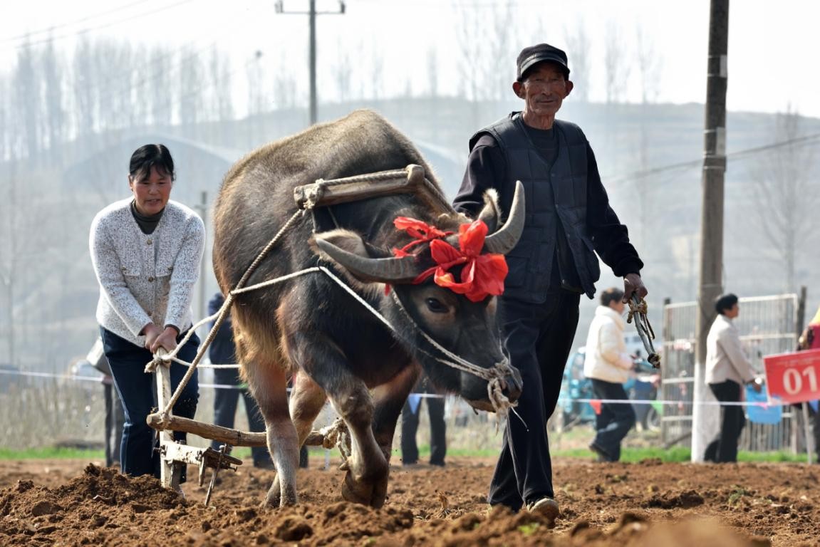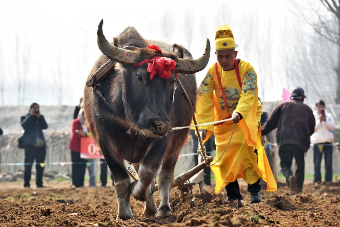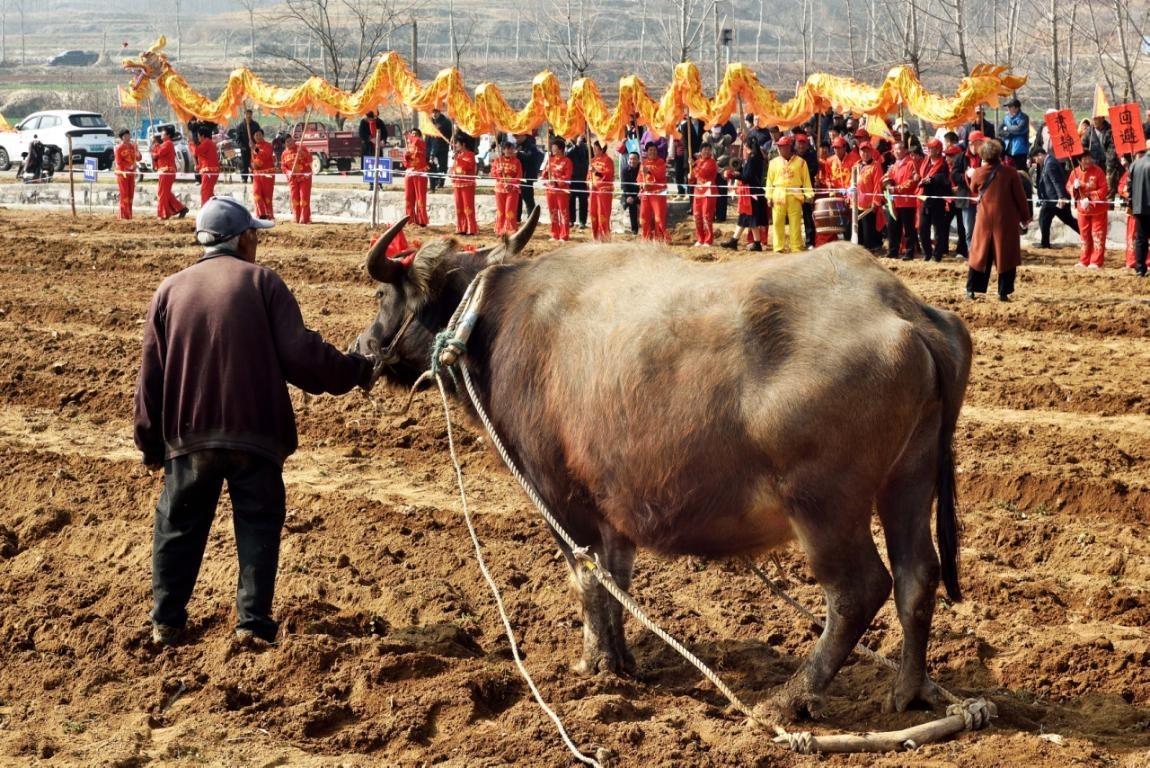 春回大地,万物复苏。3月20日,农历二月初二,俗称“龙抬头”,日照市岚山区黄墩镇迎来了延续600余年的传统民俗——“闹春牛”活动,标志着春耕生产正式拉开帷幕。清晨,农户们早早地为自家的耕牛“梳妆打扮”,披红挂彩。随着一声令下,耕牛比赛正式开锣。在“老把式”农户的吆喝声中,壮牛奋力拉动犁具,犁铧翻开沉睡一冬的泥土,现场翻起的土地变得松软平整,展现出“春牛试犁”的传统农耕场景。