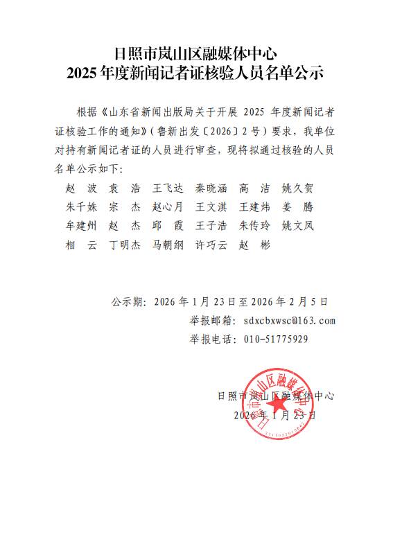 根据《山东省新闻出版局关于开展 2025 年度新闻记者证核验工作的通知》(鲁新出发〔2026〕2号)要求,我单位对持有新闻记者证的人员进行审查,现将拟通过核验的人员名单公示如下: