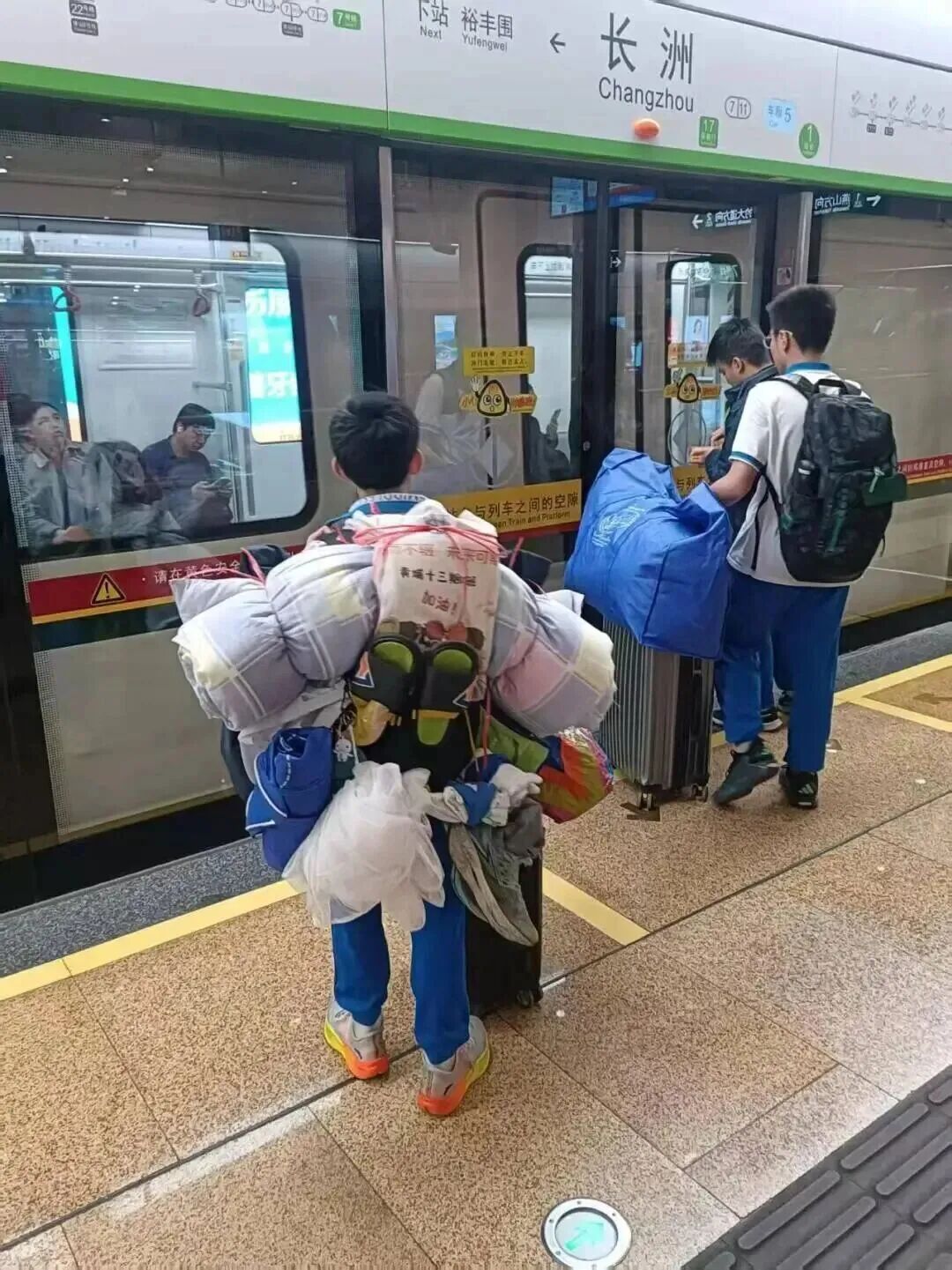 ●近日,广州一中学生用一个背影征服网友!尤其是家长们齐声称赞他的“打包神技”:“这么多东西用绳子打包背着,我一个成年人都做不到。”
